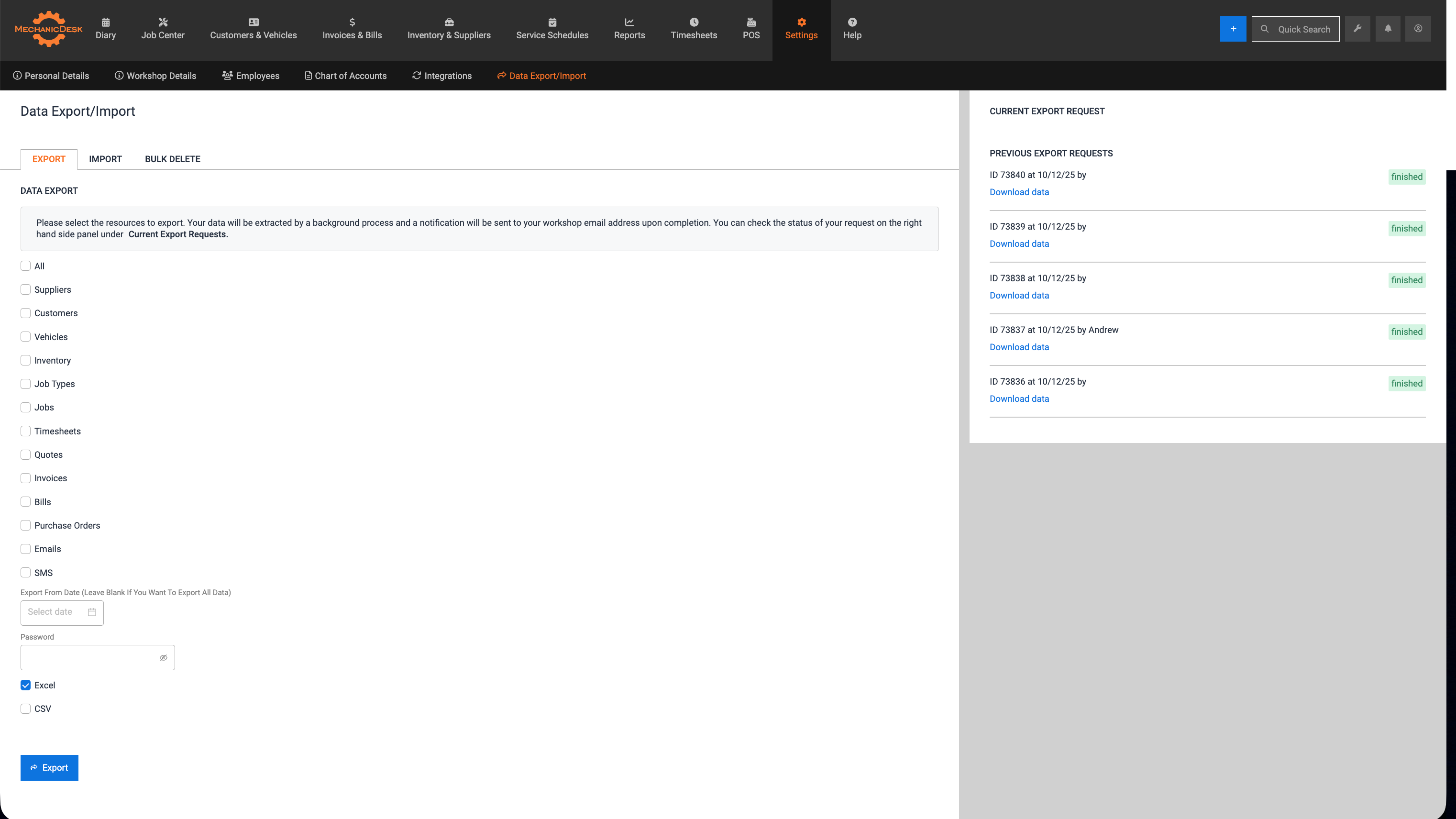MechanicDesk provides a secure data export feature that allows workshops to extract data for backup, reporting, or migration purposes. Export requests are processed asynchronously and completed files are made available within the system for a limited time.