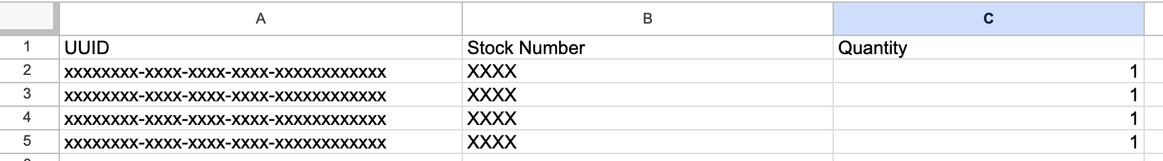 ⚠️ Important: The system uses the UUID and Stock Number to identify existing stock items. Do not modify these.